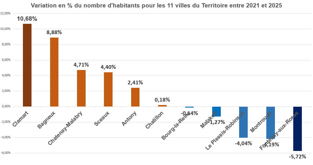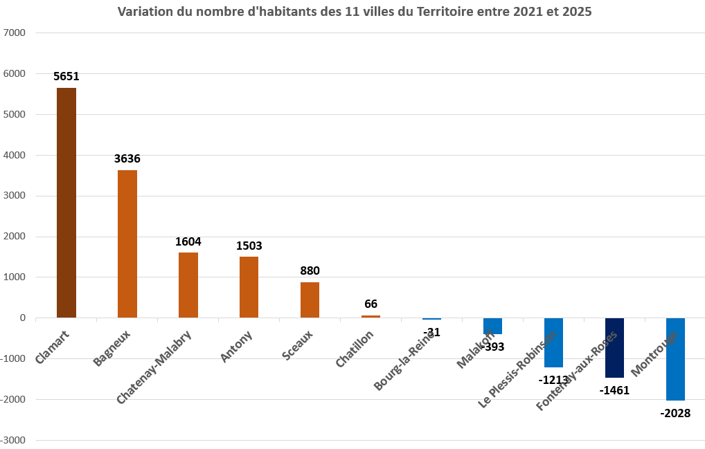 Entre 2021 et 2025 on constate qu’en pourcentage c’est à Clamart que la population a le plus augmenté et c’est à Fontenay que la diminution de population est la plus forte.