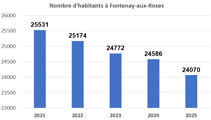 Ainsi le 26 décembre 2025, l’INSEE a donné la valeur de la population de Fontenay à 24 070 habitants*, au lieu de 24 586 habitants un an plus tôt . Cette valeur sera utilisée comme valeur de la population légale de Fontenay pour déterminer la taxe d'habitation que l'Etat versera à la Ville de Fontenay l'an prochain.