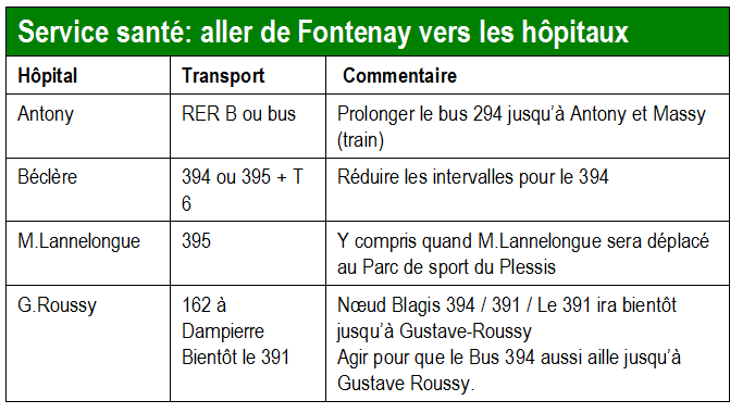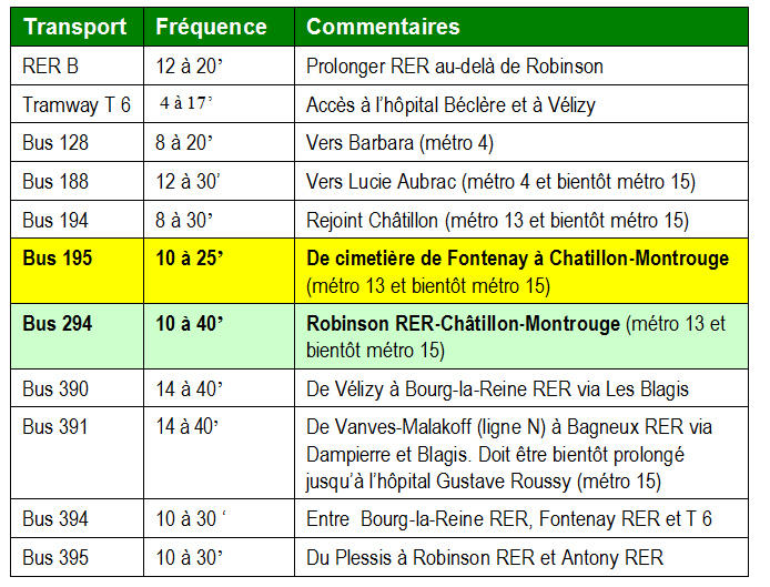 3 - Des liaisons express soient créées entre Fontenay et les stations de métro Chatillon-Montrouge et Bagneux Lucie-Aubrac, pour permettre aux Fontenaisiens d’accéder en moins de 10 minutes aux lignes de métro 13, 15 et 4 .