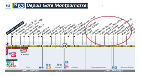 Le réseau Noctilien****, c’est un réseau de bus nocturnes en l'Île-de-France. Au total, ce sont 48 lignes de bus qui permettent aux Franciliens de se déplacer efficacement la nuit, entre 0h30 et 5h 30, dans la région Île-de-France. Ainsi entre 0h30 et 5h30, le bus N63  relie rapidement (circulation très fluide à ces heures-là) la gare Montparnasse au plateau de Saclay, en passant par Fontenay-aux-Roses, aux stations Cimetière, Théâtre des Sources, Boulevard de la République, Augustin Claude, Carrefour des Mouilleboeufs.
