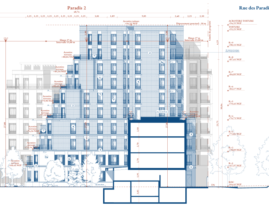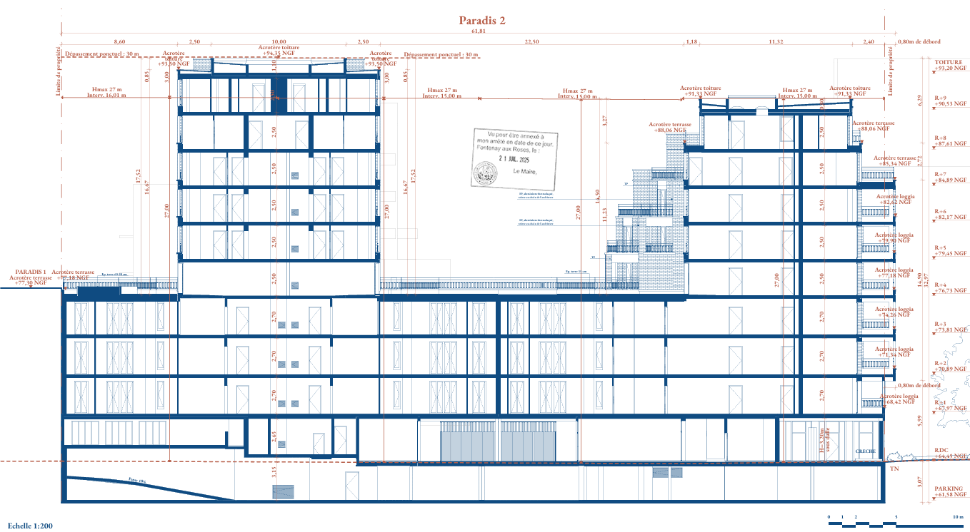 En plein été, le 21 juillet 2025, le maire a signé un permis de construire pour un ensemble immobilier de 88 logements sociaux, repartis et d’une crèche de 60 ( ou 55 ?)*  berceaux en coque brute, bâtiment R+9 , sur un terrain de 1272 m² situé 23 rue des Paradis dans la ZAC des Blagis.