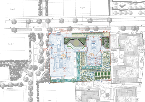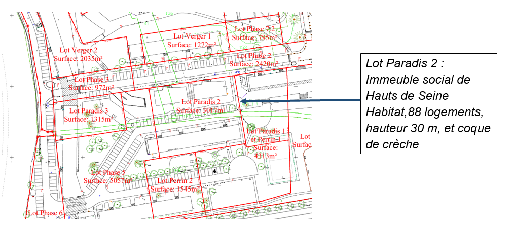 -à une grande emprise au sol du bâtiment : ci-après le plan de masse de cet immeuble massif n’y a que 30% de pleine terre, le reste est artificialisé (70%) et on constate qu’il n’y a que très peu d’arbres à grand développement.