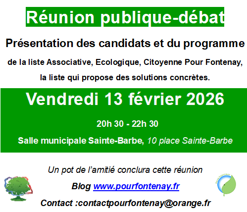 Pour répondre à la perte d’attractivité de notre ville, pour améliorer le cadre et la qualité de vie, pour préparer l’avenir, Michel FAYE et son équipe vous invitent à la à la prochaine publique de la liste Associative, Ecologique et Citoyenne Pour Fontenay :