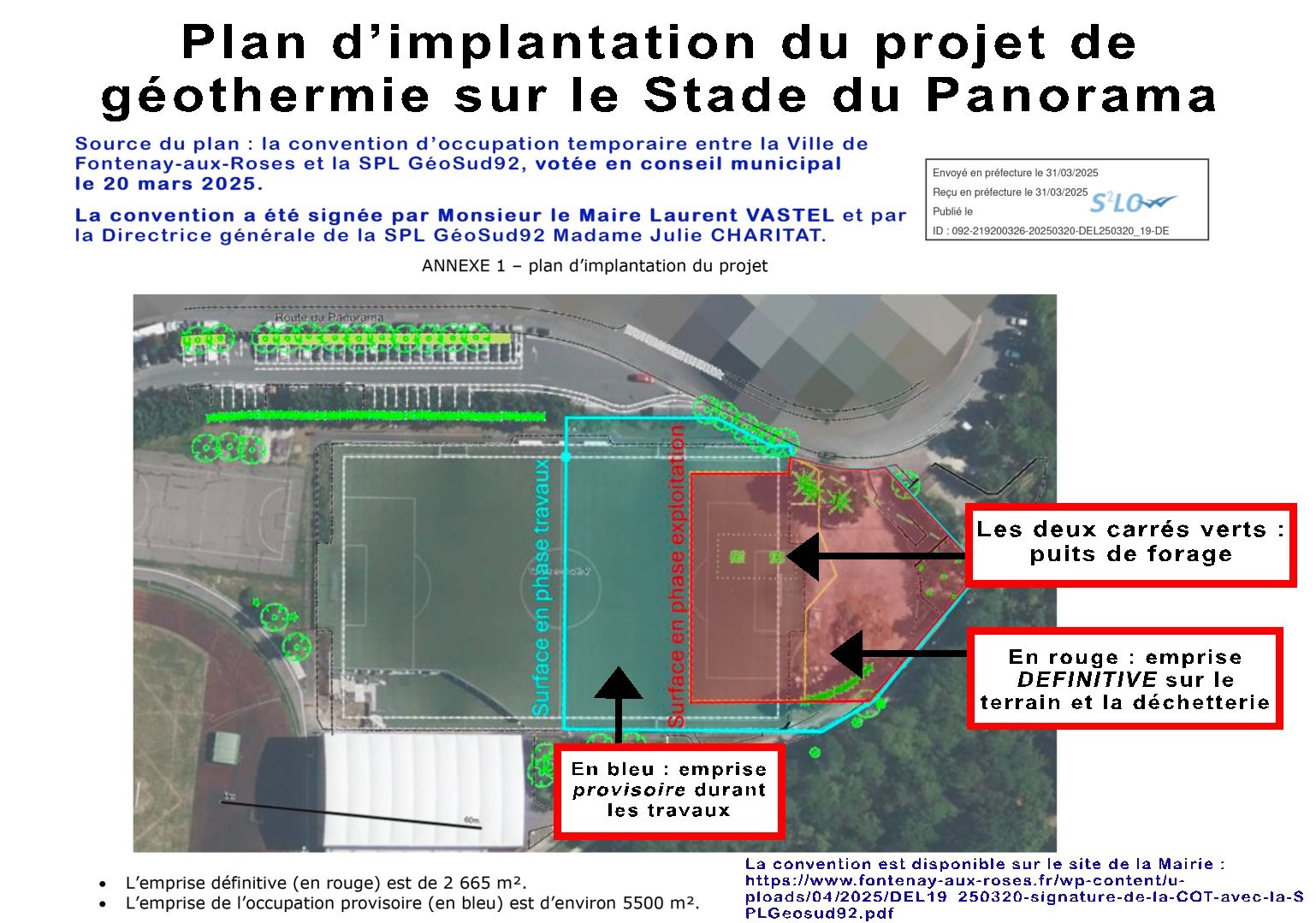 En mars 2025 a été voté en conseil municipal le projet de géothermie de la ville de Fontenay-aux-Roses dont les puits de forage viendront supprimer définitivement plus de 1100m2 du seul terrain synthétique homologué du Stade du Panorama.