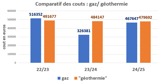 Pour l’ensemble des 3 années, le passage du gaz naturel à la « géothermie » aurait entrainé une hausse des charges de chauffage de plus de 11%. On est très loin des 15 à 20 % de baisse des charges de chauffage que le maire a indiqué au conseil municipal du 18 décembre 2025, et encore plus loin des 30% de baisse des charges de chauffage qu’il a annoncé à sa réunion publique électorale du 29 janvier 2026!
