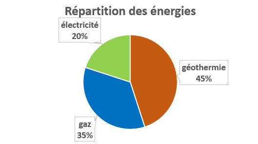 . Les différentes énergies alimentant ce réseau de chaleur : géothermie (45%), gaz (35%), électricité (20%).